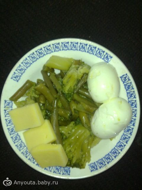 2 яйца, брокколи, стручковая фасоль отварн., сыр.