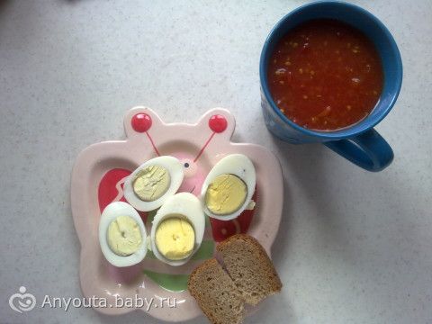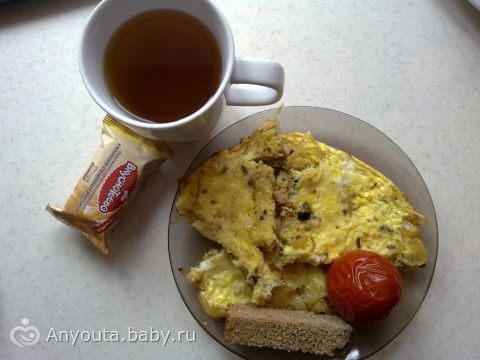 Омлет с луком, солёный помидор, хлеб. Чай, сырок.