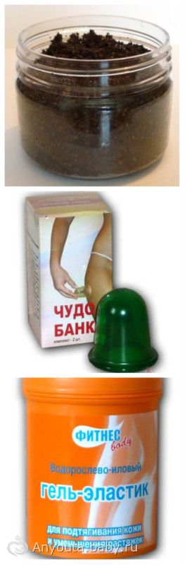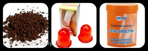 Кофейный скраб, массаж щеткой. Массаж банками+ гель эластик.