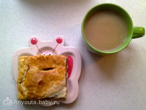 Капустный пирог, кофе с молоком, сырок.