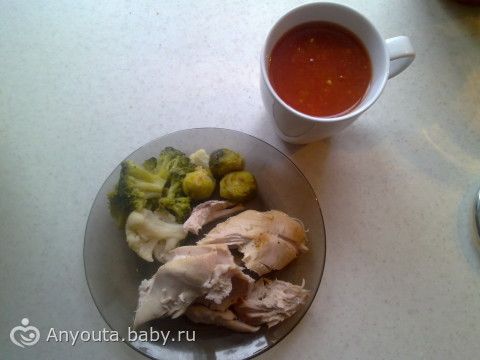 Куриная грудка, овощи на пару, сок томатный.