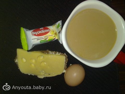 Кофе с молоком, бутерброд с сыром, яйцо, сырок.