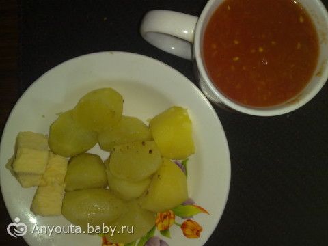Картофель отварной, кусочек сыра, сок томатный.