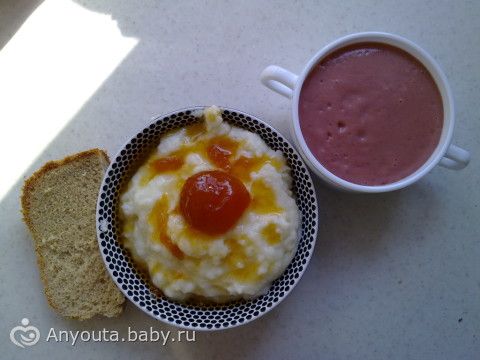 Манная каша с абрикосовым вареньем, хлеб домашний, клубнично- банановый смусси, чуть позже кофе с молоком.