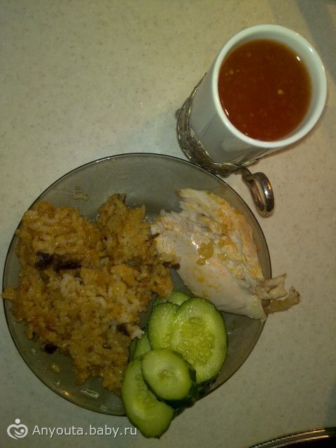 куриная грудка запеченная в фольге, рис с грибами и соевым соусом, огурец, сок томатный.