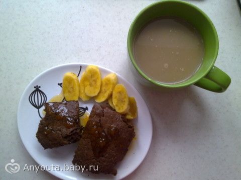 Кекс шоколадный, абрикосовый сироп, мини банан, кофе с молоком.