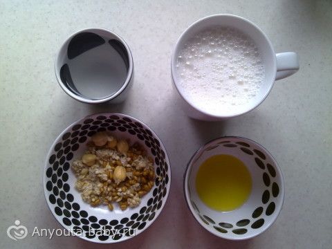 Вода с лимонным соком, льняное масло, овсянка, проросшие зерна, миндальное молочко.