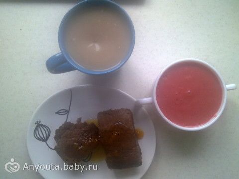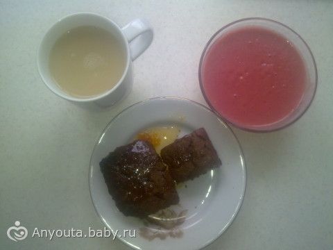 Кекс шоколадный, сироп абрикосовый, смусси клубнично- банановый, цикорий с молоком.