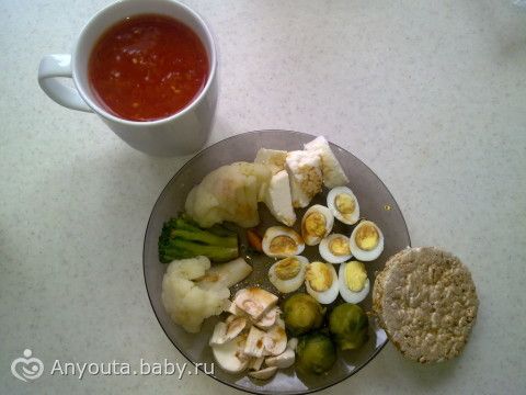 4 перепелиного яйца, овощи на пару, сыр адыгейский, соевый соус, хлебец, сок томатный.