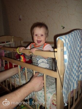 сегодня Ксеню посадила в кроватку, а у меня за ноутом на стене висит зеркало, видно как раз кроватку, и тут смотрю — СТОИТ!!! из положения сидя вставала раза 4, остальное время заваливалась!!! умничка! надеюсь завтра повторит подвиг!!! ну потом все перила у кровати грызла и пряталась за перилами от меня, потом я ее находила и мы вместе смеялись))