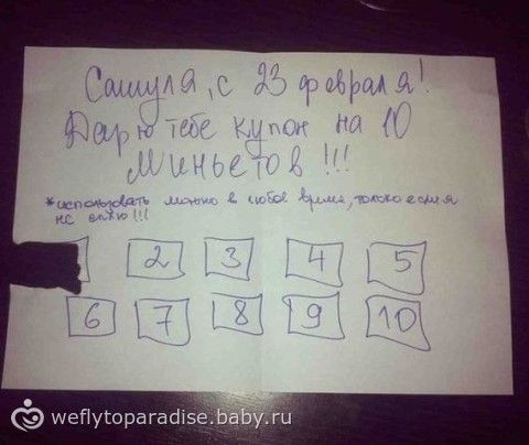 Оригинальнийший подарочек мужчине))) 4 марта 2013 20:06 Комментарии Пожалуйста, будьте вежливы и доброжелательны к другим мамам и соблюдайте правила сообщества ПожаловатьсяСкопировать ссылку Регина Голуб София13 лет Днепропетровск оригинально) ПожаловатьсяСкопировать ссылку Катерина Карина13 лет Киев я типо такого делала))) ПожаловатьсяСкопировать ссылку Анна Коцаба Андрей14 летДиана9 лет Николаев Дешево и мужу понравится ))))) ПожаловатьсяСкопировать ссылку Ирочка Никонова Катерина13 лет Пермь хахах… только та деваха устанет делать, если он выпившии будет… надо было еще одно условие добаить к тому, кроме как спит ПожаловатьсяСкопировать ссылку EllaV Сынуля13 лет да уж, в закладки! ПожаловатьсяСкопировать ссылку Китана Лисенок14 лет Киев ой класс))))))) ПожаловатьсяСкопировать ссылку Лена Михаил13 лет Киев ПожаловатьсяСкопировать ссылку РоМаШкА Анастасия11 лет Киев прикольно, следущий подарок мужу будет именно такой!!!!!!!!!! ПожаловатьсяСкопировать ссылку Наталья Карелина София12 лет Киев ПожаловатьсяСкопировать ссылку ❊Anastasia Nagaibekova❊ Тамерлан12 лет Павлодар ПожаловатьсяСкопировать ссылку Амелианна София16 летМаргарита14 летМилана10 лет Ульяновск ПожаловатьсяСкопировать ссылку ☃Жись☜♡☞Зашибись☼ Ежонок13 лет ))) и не ем ))))) ПожаловатьсяСкопировать ссылку Надюша Карамелька13 лет хих прикольно0 ПожаловатьсяСкопировать ссылку Lisi4ka Булочка12 летБублик8 лет Киев хаааха! ПожаловатьсяСкопировать ссылку Sambuca Адриан12 лет Киев Показать ещё123 Предыдущая статьяСекреты вкусного мясаСледующая статьяПоиздевалась из тыквы))) Получился салат :)Актуальные постыvr dzpfyst ecs2 дня до месячных как определить