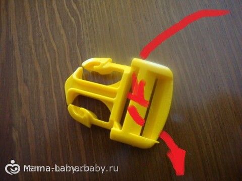 сначала стропу снизу вводишь в верхнюю щель и выводишь в нижнюю сверху вниз.