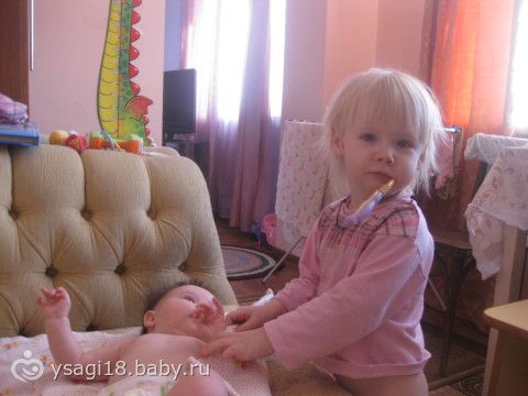 И как обычно Настя ухаживает за сестренкой. Пытается накрыть ее пеленочкой)))
