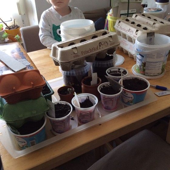 Семена взяли из моих запасов, а всякие баночки я припасала весь март потихоньку. Сеяли травы, косточки лимона, разные перчики.