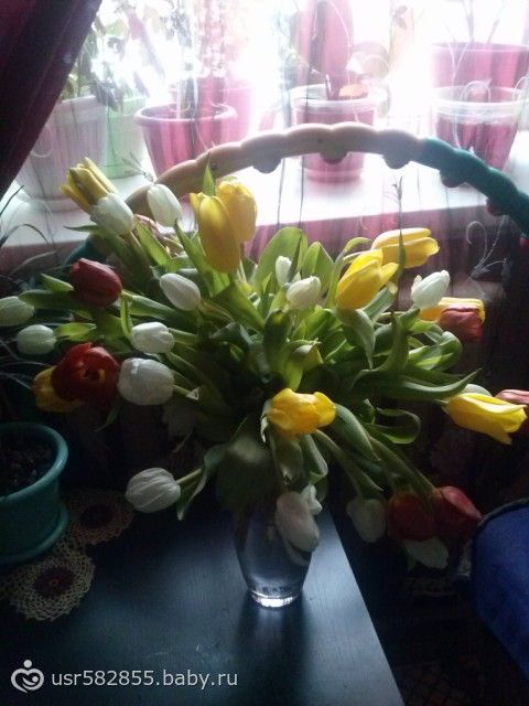 Вот такой букетик из тюльпанчиков подарил любимый муж и обруч что на заднем плане))) Обожаю его!!!!