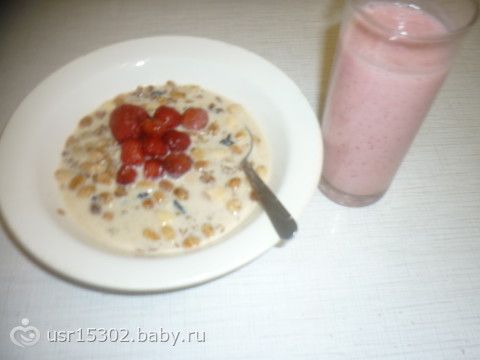 Мой полезный завтрак был таков Мюсли с молоком и клубникой и сделала себе коктейль смусси(молоко, клубника и банан смеша в блендере). Мысли очень полезны для организма. Злаки составляющие основу мюслей, содержат много клетчатки, и много витаминов.мюсли оказывают позитивное влияние на работу кишечника. Злаки, составляющие основу мюслей, содержат внушительное количество клетчатки, которая под действием жидкости начинает набухать и впитывать в себя токсины и выводить из организма.