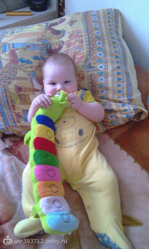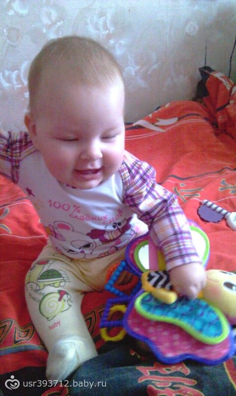 Из достижений за месяц можно отметить появление новых слогов, удачно складывающихся в «папа», «мама», «дядя». Недолго сидит, придерживаясь одной ручкой за маму. Наклевываются попытки поползти. Пока получается только поднять попку и уткнуться носиком в пол