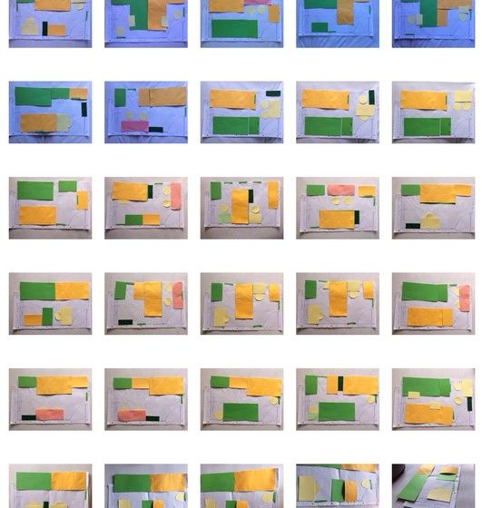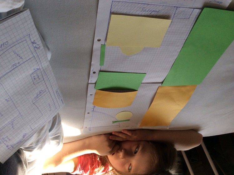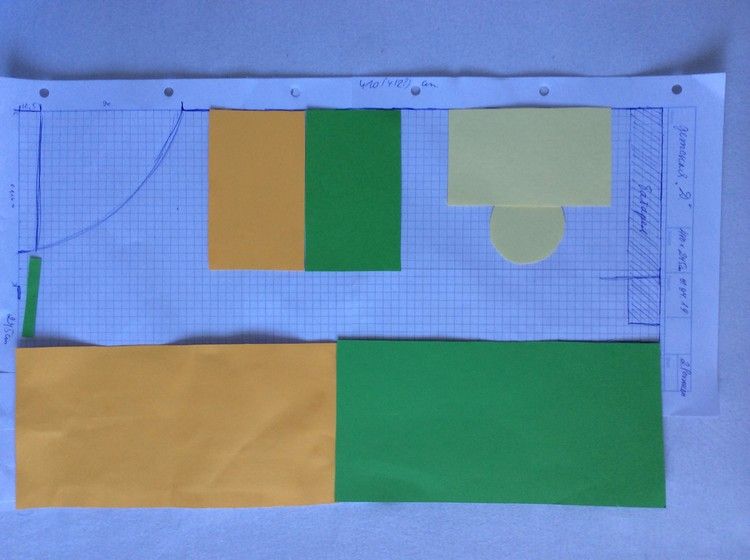Вчера я сделала замеры в комнате, потом склеила из карированной бумаги план 1:10. В такой же пропорции нарезала макеты мебели из цветной бумаги.