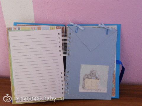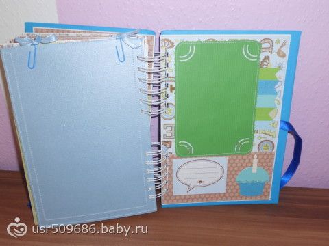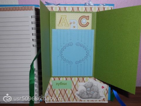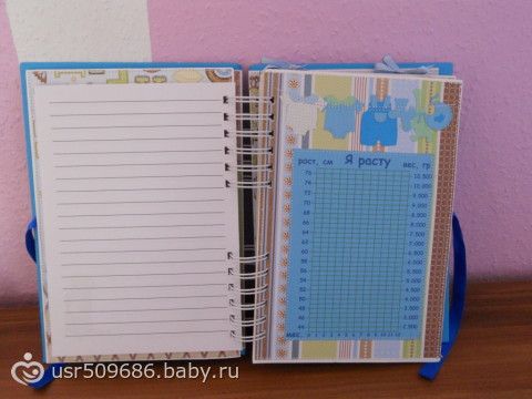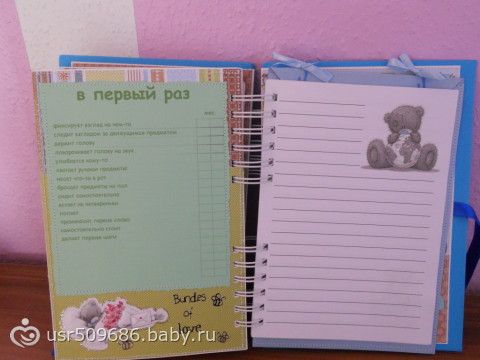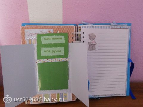 Na belih listochkah pishesh vse kak v dnevnik))))Nozhku i ruchku otpechatok na pamjat)))Zubki kak budut pojavljatsja tak i otmechaesh kogda kakoj vilez))))ochen kruto)))eshe est mesto dlja testa na beremennost i kuda vkleit foto)))a v goluboj konvertik kotorij bolshoj ja uzhe reshila polozhu pismo kotoroe ja napisala malishu)))