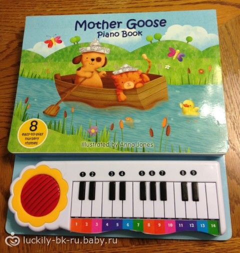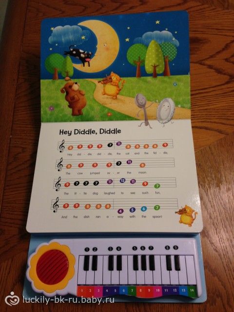 ещё вот такую книжку пианино на распродаже за 10 $ купили — в ней клавиши пронумерованы и детские песенки по нотам тоже пронумерованы — по этим цифрам можно самим мелодию играть или просто так читать, пока она не понимает и просто долбит по клавишам, но научится попозже))))