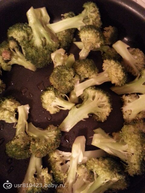 Нарезала брокколи положила на сковороду и чуть воды и накрыла крышкой, переодически помешевая их. Готовятся примерно 15 мин