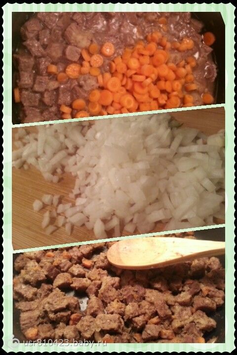 Любое мясо (у меня говядина) нарезаем кубиками и морковь и лук. Тушим мясо на сковороде, 2 раза подливаем водичку +соль+перец, на 3й раз подливаем водичку и морковь кидаем, КОГДА морковь начала становится мягкой кидаем лук и тушим под крышкой до готовности, конечно помешевая… и вуаля… такая вкуснятина!!!