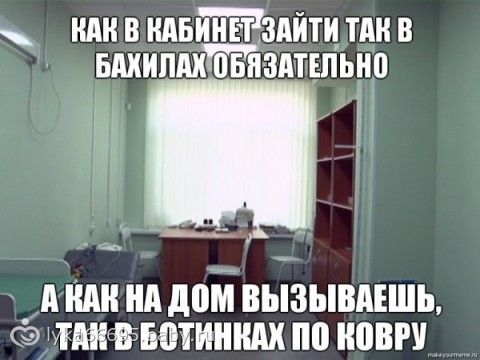 вот про врачей эт в точку!!! как им там пачкать пол дак ты че… этиож святая святых… а то то сами прутся по ковролину который хрен отмоешь… фигня… у меня подруга заставляет обувь снимать… я бахилы храню дома специально