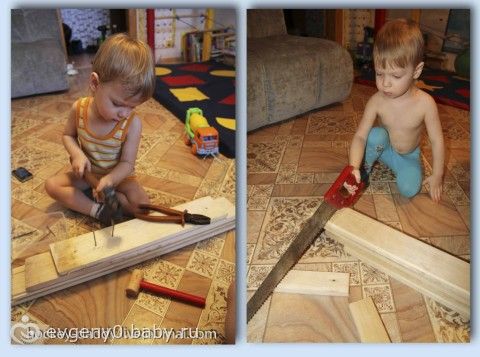 Лёшу очень давно привлекал папин ящик с инструментами, но брать его малышу удавалось редко. Я очень боялась, что Лёша может пораниться, да и мало ли что может случиться! Очень давно я посмотрела фильм семьи Никитиных, в котором совсем еще малыши сами ловко пилили, вбивали гвозди, а полуторалетняя Оля сама закручивала мелкие гайки на мелкие болты… Решила пересмотреть именно эти моменты фильма! Они придали мне уверенности в моем малыше, и вот, что у нас получилось…
