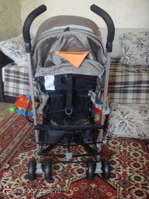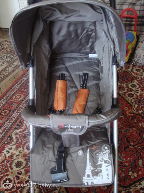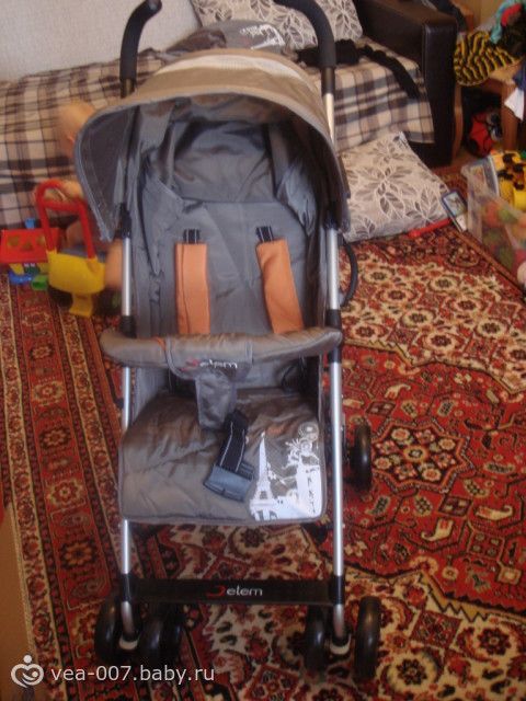 Привезли нам сегодня нашу трость Жетем Париж, гулять пока с ней не выходили, поэтому могу поделиться только первыми впечатлениями. Заказывали мы цвет бежевый, на фото в инете он везде выглядит как коричневый с оранжевыми лямками. Курьер привез коляску в заводской коробке. Первое впечатление, когда я открыла коробку — коляска серого цвета!!! Так что не верьте фотографиям в инете, Жетем Париж бежевого цвета на самом деле имеет такой же серый цвет, что и Жетем Лондон!!! Правда если долго приглядываться, то иногда проскальзывает оттенок коричневатого и даже немного оливкового, т.е. зеленоватого цвета! Но я все равно довольна, совсем не маркая и за счет такого цвета добавляет дороговизны себе, в отличие от голубого, зеленого и оранжевого цветов. Коляска была в разобранном виде, т.е. все ее части были отдельно –колеса, бампер, капюшон, но я сама собрала ее за 20 минут даже не открывая инструкции! Так что пусть вас не пугает указание в инет магазине, что коляска поставляется в разобранном виде! Вес коляски с накидкой на ножки 7,7 кг, без накидки – 7,4 кг (на напольных электронных весах), ширина шасси 53 см, а не 48 как заявлено в инет-магазинах, высота ручек 109 см, для моего роста 165 см это выше крыши, даже хочется взяться еще и пониже. Достаточно маневренная, испытание на маневренность прошла на отлично в нашей старой малогабаритной хрущевке, лавируя с сидящим ребенком между столом, шкафом, диваном и стульями!!! Хочу сказать, что пока отзывы о том, что в ней надо нажимать по очереди на тормоз, то одной ногой то другой, вызывают у меня некоторое удивление. У меня тормоз и ставится и снимается одной ногой!!! Немного не понятна также смысловая нагрузка окошка на капе, оно сетчатое и в него действительно мало что видно, а солнце оно, судя по всему, пропускать будет, так что его наверно стоит рассматривать только как определенный декор!Правда я сделала открытие-эту сеточку можно аккуратно срезать и будет полноценное смотровое окно! Капюшон действительно раскладывается почти до бампера, перемычка между ножек очень удобна, даже не представляю сейчас как без нее обошлась бы, ребенок никуда не сползает, сиденье тоже очень удобное, даже не смущает наклон спинки, ребенку он не доставляет дискомфорта, как это было в нашей капелле 901, бампер хорошо расположен, ребенок замечательно сидит, держась за него, ткань на бампере на молнии и легко снимается для стирки, утепленная накидка на ножки действительно очень плотная, думаю можно кататься даже до декабря! Регулировка спинки ремнями немного неудобна, но это дело привычки! Малость не нравится материал ручек, кажется вспененный каучук (такой же как на капеллах и жетемках под цветными накладками), мне кажется летом от них будет очень жарко рукам, я все же за пластиковые ручки! Читала отзывы про запах новой коляски, ну если поднести нос непосредственно к ткани, то действительно немного чувствуется химический запах новой коляски, но в комнате этот запах не стоит!!! Когда ребенок сидит в коляске передние колеса легко поднимаются, т.е. заезжать на бордюры можно будет, думаю, без проблем, об этом тоже читала во многих отзывах. Корзина для покупок маловата, но зато в отличие от перего, расположена очень высоко и не будет скрести даже по самым высоким бордюрам! Положение лежа примерно 170 градусов. Складывается просто, без отстегивания б