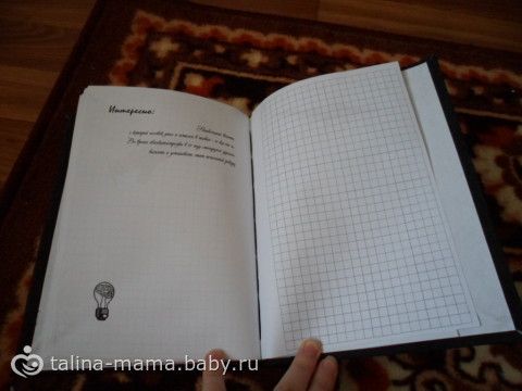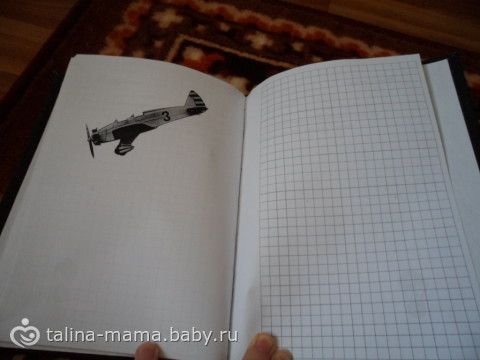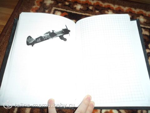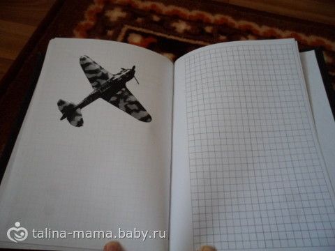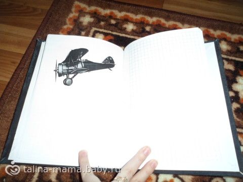 Каждая правая страница — клеточки. А левые все разные — чередовались записи «интересно» и самолёты. Каждый самолёт вырезался в фотошопе и доводился до ума. Все самолёты времён СССР.