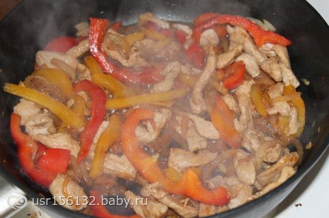 когда весь сок выпариться и мясо поджариться, добавляем лук, перемешиваем и добавляем перец