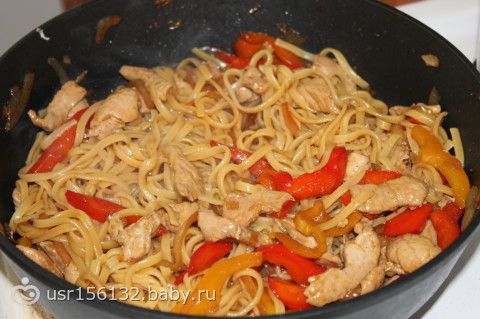 добавляем лапшу и еще соуса, чтобы не было блюдо сухим.ВАЖНО не переборщить с соусом, пробуйте на вкус