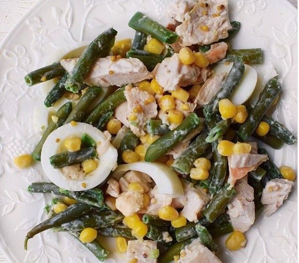 ᅠ?Смешать курицу, яйца, фасоль, кукурузу.