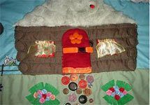 На холме у нас живут две девочки (куплены на фурнитуре), к которым пришиты петли для крепления на пуговицы. Здесь же расположен маленький домик (термоаппликация), пришиты цветы, трава и собачка-пуговка. Из старых бус я нашила дорожку к домику и ступеньки, которые, собственно, ведут нас на холм. По этим ступенькам хорошо бегать маленьким проворным пальчикам (чем не упражнение на моторику:).