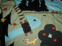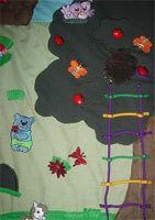 Дерево растет на обрыве. На дереве есть кармашки, здесь же пришиты яблоки-пуговки и живут птички (на липучке). Вдалеке виднеется мишка (на липучке), который любит собирать цветы. А когда ему хочется перекусить, он лезет на дерево за медом. Там есть улей, охраняемый пчелками (аппликации).