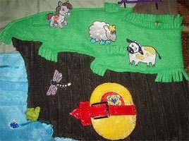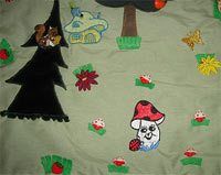 Луг сделан из флиса (вообще флис наиболее оптимален в изготовлении детских мягких игрушек, но, к сожалению, я была ограничена в цветовой гамме). На лугу пришиты цветы-пуговки. Здесь у нас пасется мягкая коровка-брелок и гуляют 4 керамических поросенка (куплены на сувенирах). Ниже растет куст, который пришит в виде кармашка, как и остальные кустики на ковре. В эти «кармашки» я люблю прятать животных с коврика, а Артемка отгадывает, кто спрятался по торчащим ушкам и хвостам. На кустике у нас мышка/бабочка-прищепки.