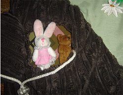 Берлога (вельвет) расположена на поляне в лесу. Дверь открывается с помощью регулятора, который обычно встречается на куртках. В берлоге обитает мягкий маленький мишка, к которому в гости приходит зайчиха (оба предмета куплены на распродаже и раньше были обычными брелоками). Здесь же на лесной поляне есть серый зайка, который посажен на крупную кнопку, бабочка–аппликация (пришита только посредине, чтобы можно было при желании помахать крылышками), клубничка–пуговка.