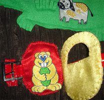 Лес на ковре представлен велюровыми елями, в которых спрятана молния. В лесу живет маленький зайка (куплен на сувенирах), за которым все время охотится лиса. Лось на липучке. На елке также сидит бабочка на маленькой прищепке (тоже куплена на сувенирах). Кстати, научиться справлять с прищепкой – это целое достижение. У Артема пока получается через раз. На самом деле пружина здесь слабая, а сама прищепка абсолютно безопасна для ребенка.