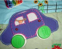 За дверью находятся два кармашка, в которые можно посадить любого жителя нашего коврика и покатать. Сейчас там сидит маленькая девочка (снята с детской заколки). За машиной – плетень. Здесь растут подсолнухи-пуговки.