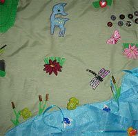 Озеро сделано из голубого сатина, покрыто сверху органзой. На озере сделаны небольшие кармашки-волны, где прячутся рыбки-пуговки. Рыбки крепятся на ленточках. У озера растут камыши (вышиты обычной ниткой мулине), здесь же летают стрекозы-аппликации (на кнопках). Есть также уточки-пуговки, которые одеты на ленту и плавают по озеру. Цветы-аппликации на липучках, их можно срывать, а потом опять высаживать. Олененок на кнопке. Керамических лягушек я тоже нашла на сувенирах.