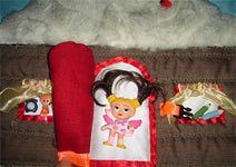 Кораблик я делала практически в последний день (почерпнула идею из какого-то детского сайта, хотя до этого как-то не приходила мысль покопаться в Интернете, а зря… там есть много интересного). Сам кораблик изготовлен в виде кармана из полосатой ткани. На карман я нашила спасательный круг (аппликация) и якорь (металлическая петелька).