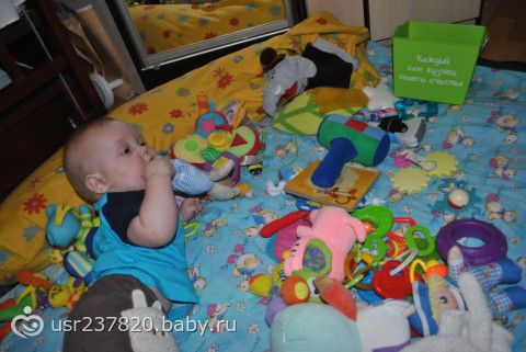 Мальчик сегодня буйный, кружится, как кружок весь день, в кровати сидеть не хочет, от жалюзи я замучилась его оттаскивать. Настелила на полу, чтоб тепло было и отправила лялю гулять, он ошалел от того, что можно лезть куда хочешь и никто тебя не оттаскивает, полез сразу куда не надо