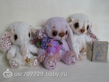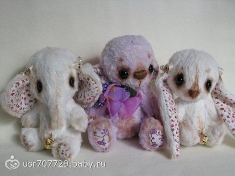 Поясню немного. Это мишки- тедди. То есть все у них двигается- ручки, ножки и голова. Внутри стоят специальные суставчики, Эти малыши очень маленькие зайка 10 см, слоник 11 см и мишка 12 см. Соответственно- шить их сложнее раз в 30, чем обычного мишку) Но удовольствия- МОРЕ!!! Последняя картинка специально, чтобы представить реальный размер)