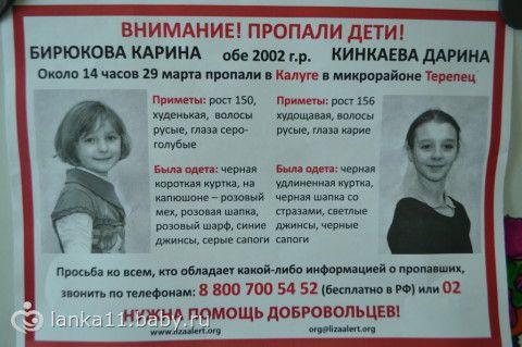 С самого утра по району бегают толпы полицейских, солдат… Всех добровольцев просят распространить листовки… Может кто что видел? Вчера около 14 часов дня у обоих девочек отключились сотовые… И это страшно, страшно что вот прямо около нас такое случается, когда вроде никто и не ожидал и район тихий и вообще… В общем берегите своих деток и если кто что знает звоните по телефонам в листовке