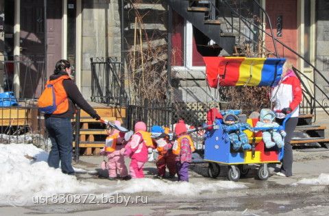 На прогулку с младшей группой (не старше полутора лет, по моей оценке) выходят два воспитателя. Малышей до года (тут всех берут в ясли, начиная с рождения) сажают в тележку (типа тележки для мороженого, с зонтом от солнца или осадков), пристегивают, и они гуляют на тележке, болтая ногами и пуская пузыри. На моей картинке таких мелких лялек — 4 человека, по два с каждой стороны тележки. Люди постарше идут пешком. Ну, идут как умеют, конечно. На них надевают яркие жилетики, воспиталка — в таком же ярком жилете, всё время пятится задом по тротуару, чтобы издалека было заметно и пешеходам, и велосипедам, и машинам. И еще они все держатся за страховочную веревку. Для каждого маленького человека на этом репшнуре предусмотрена петелька, к которой его пристегивают, чтобы не потерялся и не отстал. Вся эта процессия медленно-медленно движется вдоль улицы, поминутно останавливается, чтобы то шапку поправить, то подождать запутавшегося в страховке малыша, а то и просто поговорить. Воспитатели очень приветливо и терпеливо разговаривают с каждым (дети говорить еще не умеют!!!), одновременно следя за дорогой и временем, встречные пешеходы улыбаются и уступают дорогу, залезая на сугроб, водители терпеливо пережидают, пока караван переходит улицу.