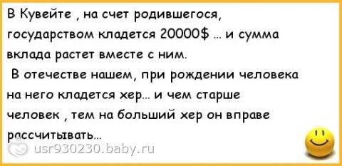 не… мы хотим, чтобы КАК в Кувейте на счет каждого родившегося переводили определенную сумму денегнашу ж нефть с газом за бугор продают… и нефть и газ наших детей и внуков и правнуков и пра-правнуков.
