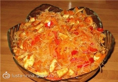Все ингредиенты (кроме фунчозы) выложить в чашу мультиварки, добавить воду, масло, соль и специи. Перемешать. Закрыть крышку, выбрать программу ТУШЕНИЕ, время приготовления 50 мин.