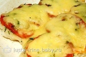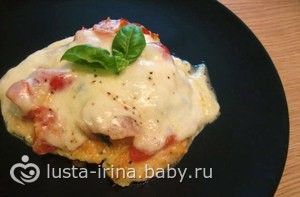 Перевернуть. Выложить сверху помидоры, смешанные с зеленью и чесноком, сверху посыпать сыром. Выбрать программу ЖАРКА/ВЫПЕЧКА, время приготовления 15-20 мин.