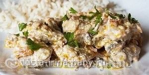Добавить сметану, воду, соль и специи. Перемешать. Выбрать программу ТУШЕНИЕ, время приготовления 30-40 мин.