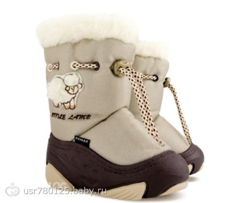 Очень легкие, прочные, влагостойкие (однако если ребенок перегуляет по снежной мяше или лужам – промокнут). Подошва из полиуретана (могут быть скользкими). Под покрытием находится слой теплоизолирующей пластмассы, подкладка выполнена из искусственного меха высокого качества.